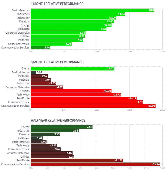 1일/한달/3달/반년 섹터별 등락률을 통해서, 시장 상황을 가늠해볼 수 있습니다.