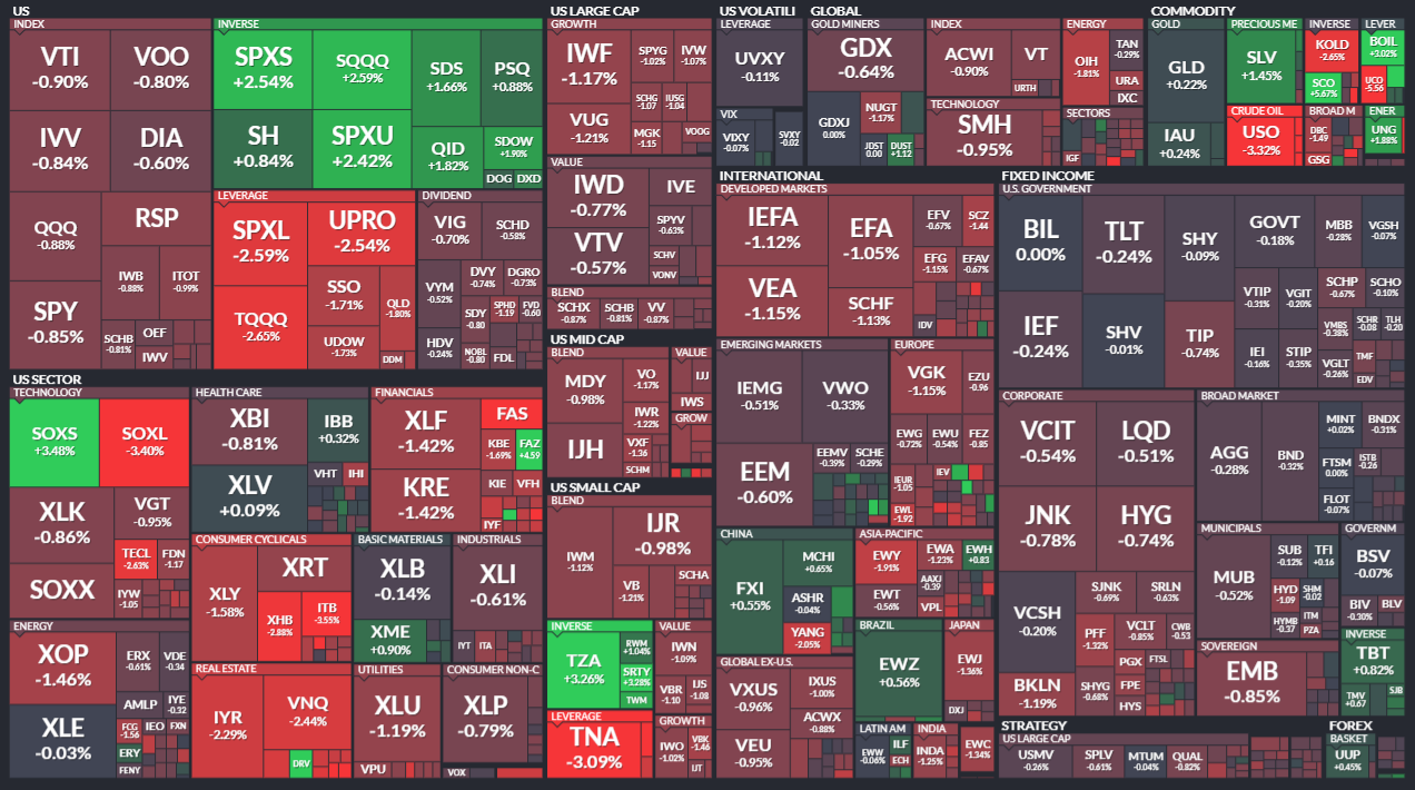 미국 ETF의 등락률을 통해서 시장의 흐름을 살펴봅니다. 특히 주가 MAP과는 다르게 채권이나 원자재, 개발도상국 지수 추종 ETF 등도 살펴볼 수 있기 때문에 좀 더 큰 시장의 흐름을 알 수 있습니다.