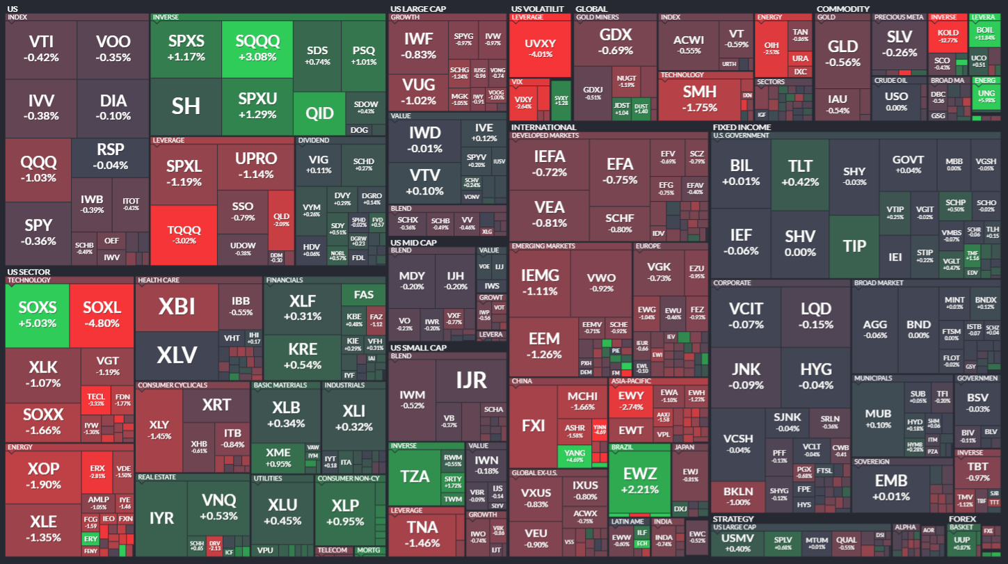 미국 ETF의 등락률을 통해서 시장의 흐름을 살펴봅니다. 특히 주가 MAP과는 다르게 채권이나 원자재, 개발도상국 지수 추종 ETF 등도 살펴볼 수 있기 때문에 좀 더 큰 시장의 흐름을 알 수 있습니다.