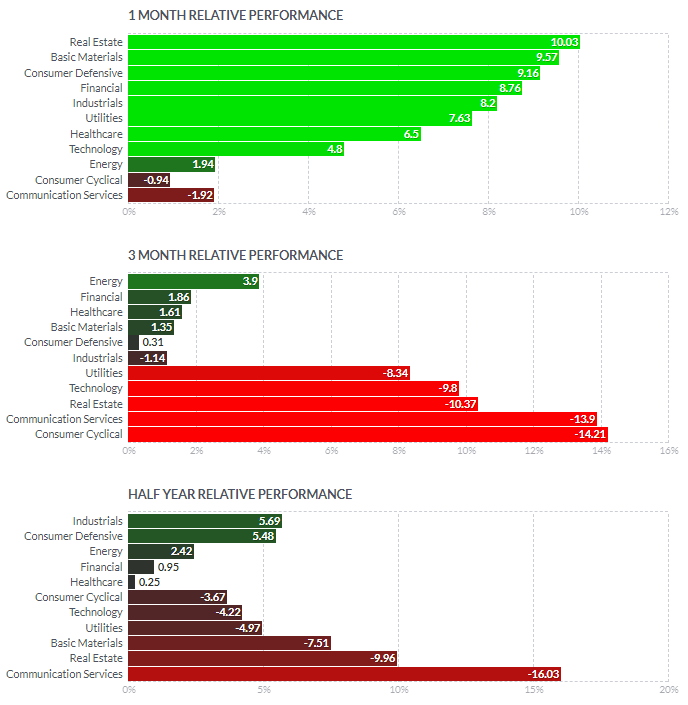 1일/한달/3달/반년 섹터별 등락률을 통해서, 시장 상황을 가늠해볼 수 있습니다.