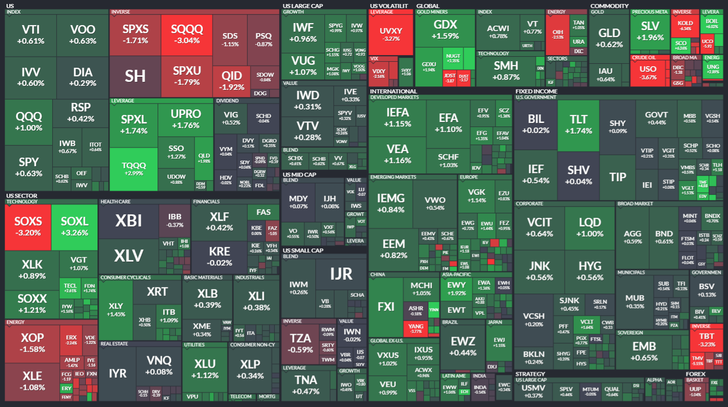 미국 ETF의 등락률을 통해서 시장의 흐름을 살펴봅니다. 특히 주가 MAP과는 다르게 채권이나 원자재, 개발도상국 지수 추종 ETF 등도 살펴볼 수 있기 때문에 좀 더 큰 시장의 흐름을 알 수 있습니다.