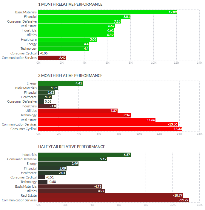 1일/한달/3달/반년 섹터별 등락률을 통해서, 시장 상황을 가늠해볼 수 있습니다.