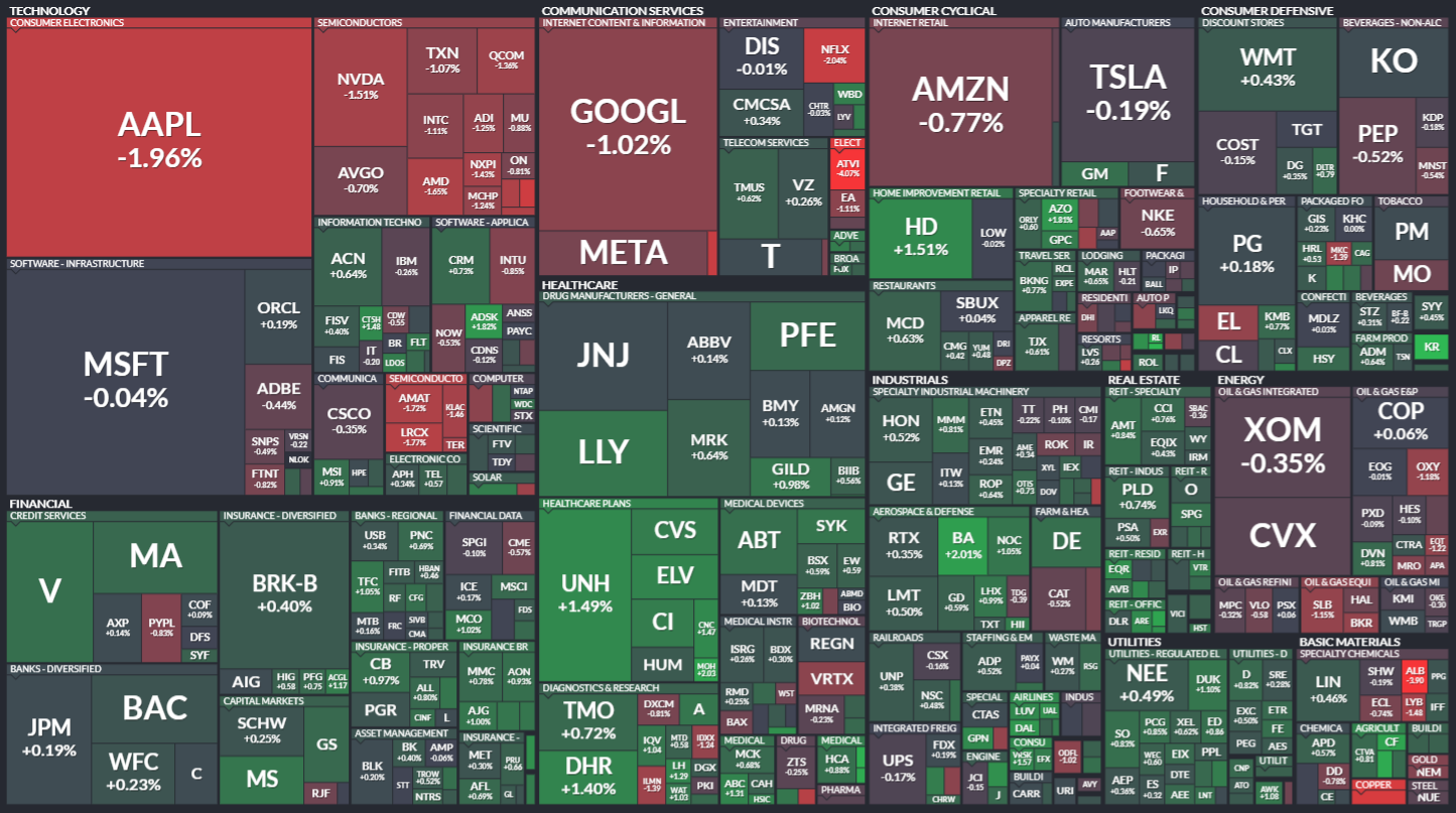 미국 S&P500에 속한 기업들의 주가 등락을 살펴봅니다. 같은 섹터 내에서도 개별 기업 이슈로 인해 주가가 서로 다르게 움직이는 것을 볼 수 있습니다. 특히 섹터 내 대장주, 주도주의 움직임을 통해 해당 섹터의 성장성을 가늠해보기 좋습니다.