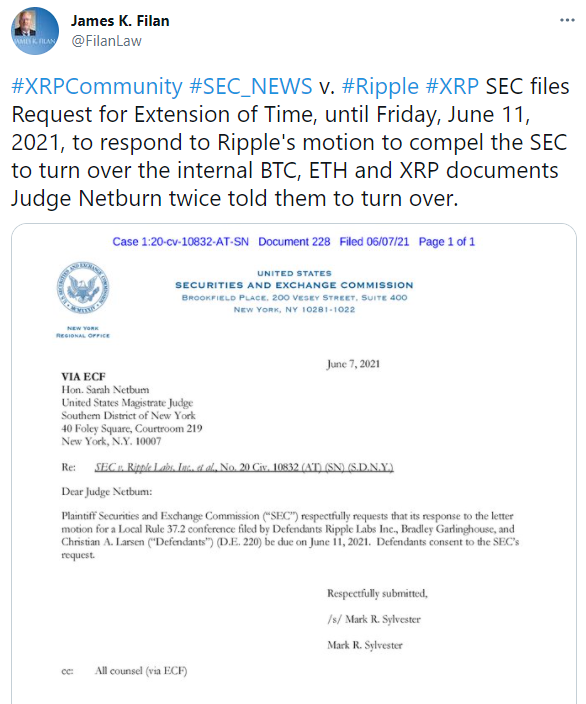 암호화폐 XRP(리플)의 유가증권 문제를 둘러싼 재판에서, SEC측은 7일, 리플측이 요구한 「XRP가 유가증권에 해당한다는 주장에 관한 증거 공개」에 대해서, 답변에 관한 기한 연장 신청을 Netburn 재판관에 제출했다.