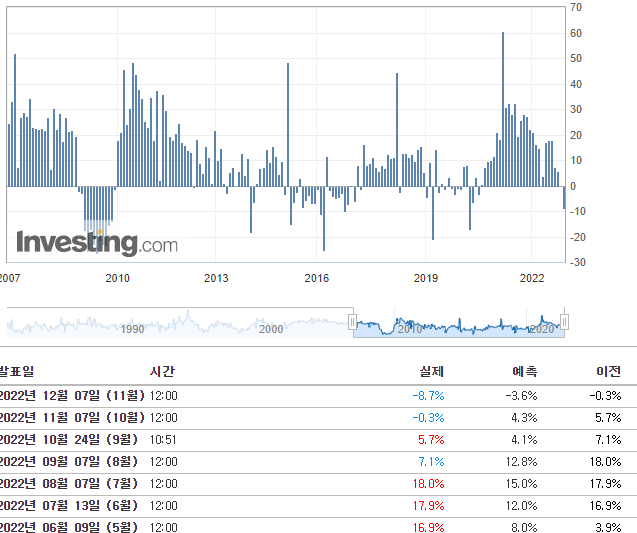실제로 중국은 세계의 공장으로 불리우는 만큼 중국의 생산자 물가지수가 글로벌 인플레이션에도 영향을 미칩니다. 이러한 중국의 수출액 감소는 글로벌 수요 감소에 대한 결정적인 신호로 볼 수 있는 것 입니다.