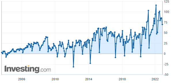 → 전년 대비 소매판매 7.6% / 전월 대비 소매판매 -0.6%(예측 -0.1%) : 소매판매가 급히 감소하는 모습이 나타나고있습니다. 미국의 소비 수요가 감소하는 것으로 볼 수 있겠습니다.