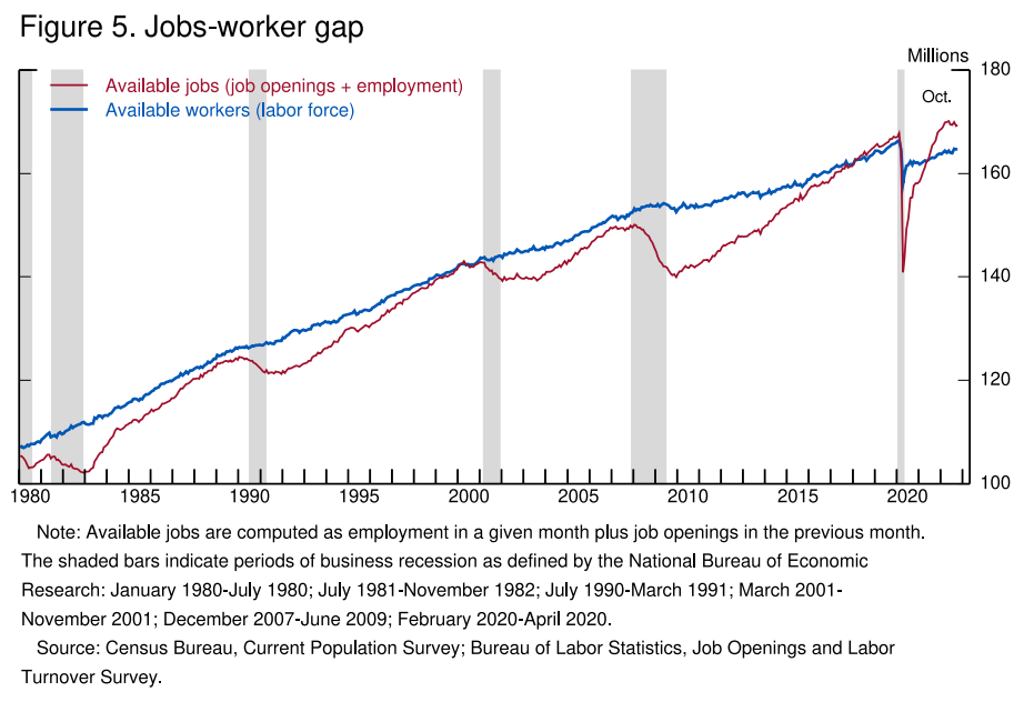 2021년 중반에 갑자기 노동 시장 경색의 징후가 나타났습니다. 당시 실업률은 대유행 이전에 긴축의 큰 징후 없이 우세했던 3.5%보다 훨씬 높았습니다. 고용은 대유행 직전 수준보다 여전히 수백만 달러 낮았습니다. 돌이켜보면 팬데믹 기간 동안 심각하고 지속적인 노동 공급 부족이 발생했음을 알 수 있습니다. 이러한 부족은 곧 완전히 해결될 것 같지 않습니다.