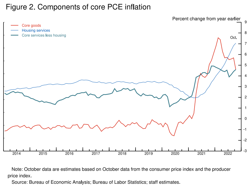 지난 1년 동안 긴축 정책과 느린 성장에도 불구하고 우리는 인플레이션 둔화에 대한 명확한 진전을 보지 못했습니다. 인플레이션을 낮추기 위해 무엇이 필요한지 평가하려면 근원 인플레이션을 근원 상품 인플레이션, 주택 서비스 인플레이션, 주택 이외의 근원 서비스 인플레이션의 세 가지 구성 요소 범주로 나누는 것이 유용합니다( 그림 2 ).