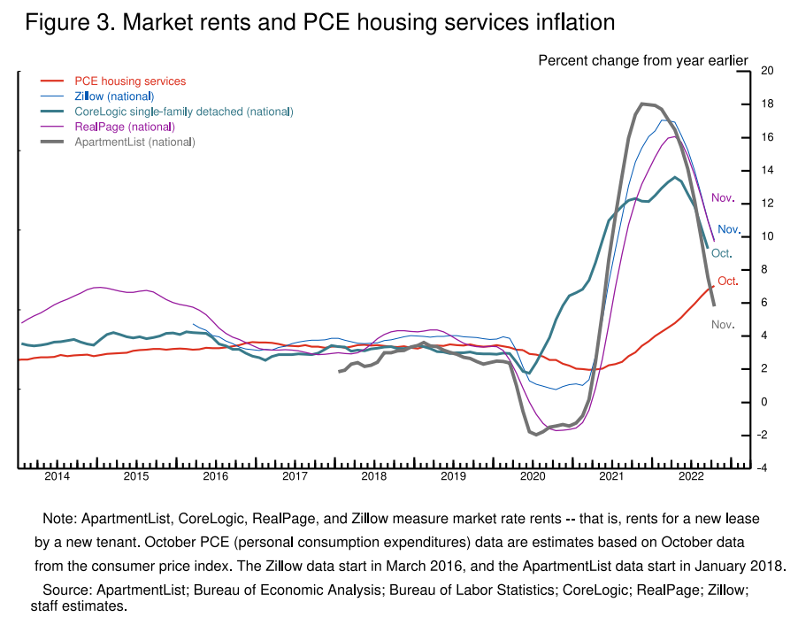 그러나 그림 3에서 볼 수 있듯이 기존 임대가 전환되고 새로운 임대에 대한 더 높은 수준의 임대료를 따라잡기 위해 가격이 급등함에 따라 전반적인 주택 서비스 인플레이션은 계속 상승했습니다. 이는 내년에도 계속될 가능성이 높다. 그러나 신규 임대 인플레이션이 계속 하락하는 한 내년에는 주택 서비스 인플레이션이 하락하기 시작할 것으로 예상됩니다. 실제로 이 인플레이션의 감소는 인플레이션 감소에 대한 대부분의 예측의 기초가 됩니다.