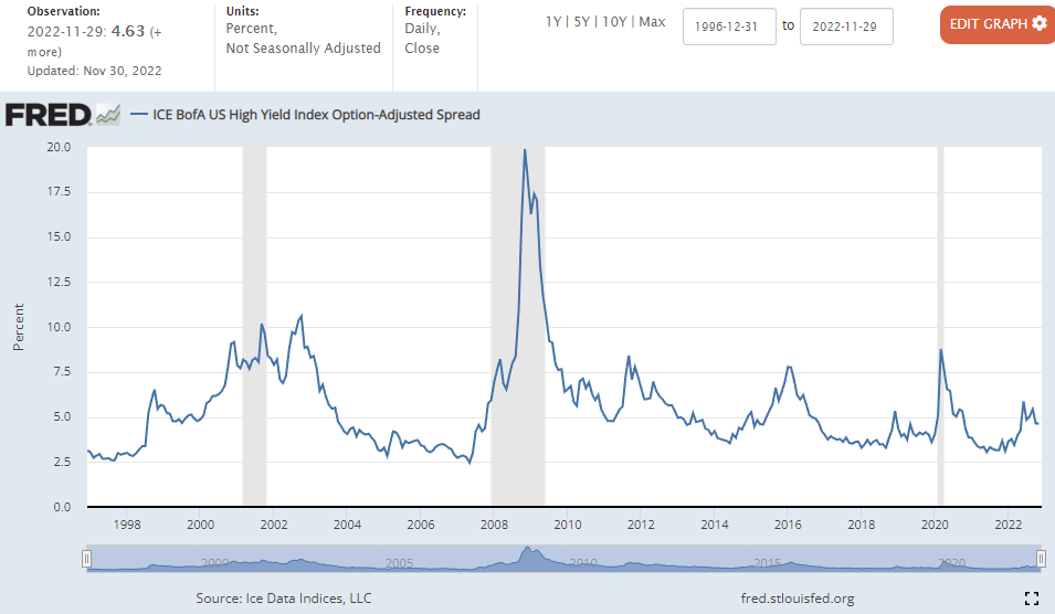 하이일드 채권 스프레드 : 하이일드 채권 수익률 에서 국채 수익률을 뺀 값으로, 이 값이 상승하면 시장이 위험하다는 신호로 볼 수 있습니다. 4% 이하로 하락해야 시장이 안정적인 것으로 판단합니다.