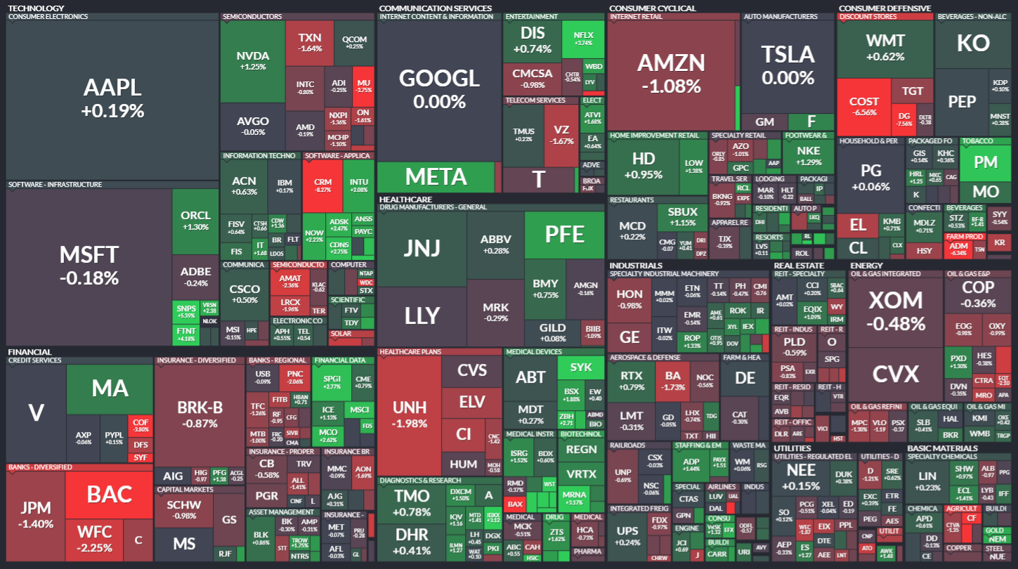 미국 S&P500에 속한 기업들의 주가 등락을 살펴봅니다. 같은 섹터 내에서도 개별 기업 이슈로 인해 주가가 서로 다르게 움직이는 것을 볼 수 있습니다. 특히 섹터 내 대장주, 주도주의 움직임을 통해 해당 섹터의 성장성을 가늠해보기 좋습니다.