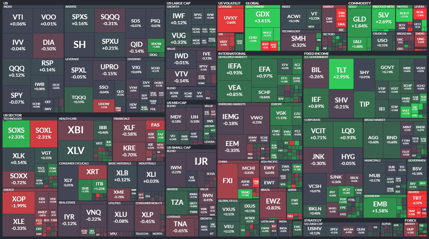 미국 ETF의 등락률을 통해서 시장의 흐름을 살펴봅니다. 특히 주가 MAP과는 다르게 채권이나 원자재, 개발도상국 지수 추종 ETF 등도 살펴볼 수 있기 때문에 좀 더 큰 시장의 흐름을 알 수 있습니다.