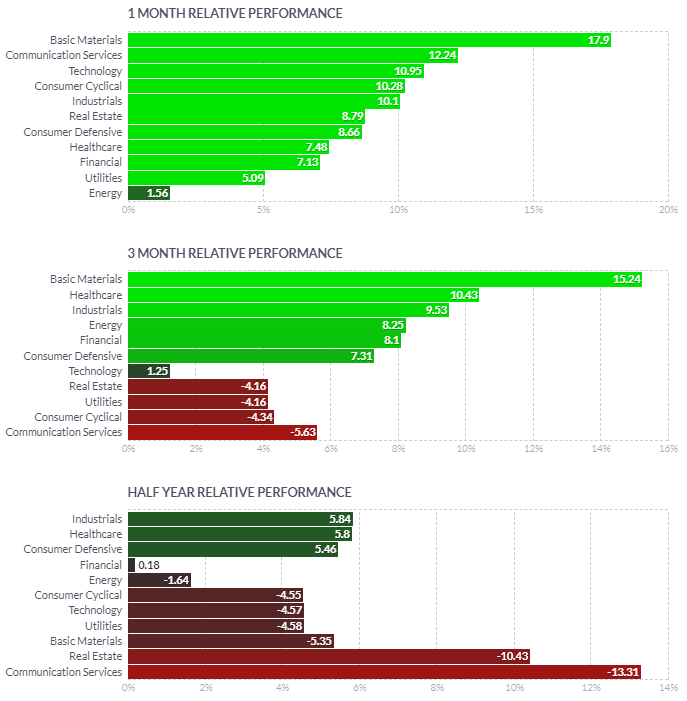 1일/한달/3달/반년 섹터별 등락률을 통해서, 시장 상황을 가늠해볼 수 있습니다.