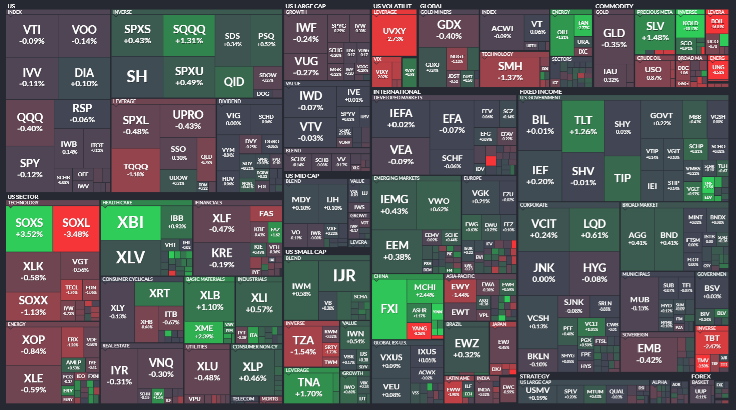미국 ETF의 등락률을 통해서 시장의 흐름을 살펴봅니다. 특히 주가 MAP과는 다르게 채권이나 원자재, 개발도상국 지수 추종 ETF 등도 살펴볼 수 있기 때문에 좀 더 큰 시장의 흐름을 알 수 있습니다.