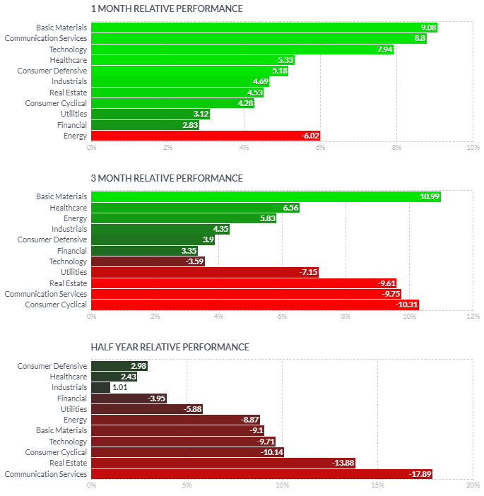 1일/한달/3달/반년 섹터별 등락률을 통해서, 시장 상황을 가늠해볼 수 있습니다.