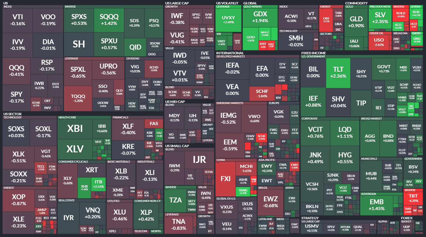 미국 ETF의 등락률을 통해서 시장의 흐름을 살펴봅니다. 특히 주가 MAP과는 다르게 채권이나 원자재, 개발도상국 지수 추종 ETF 등도 살펴볼 수 있기 때문에 좀 더 큰 시장의 흐름을 알 수 있습니다.
