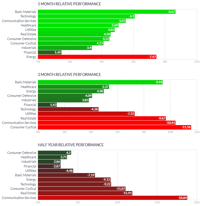 1일/한달/3달/반년 섹터별 등락률을 통해서, 시장 상황을 가늠해볼 수 있습니다.