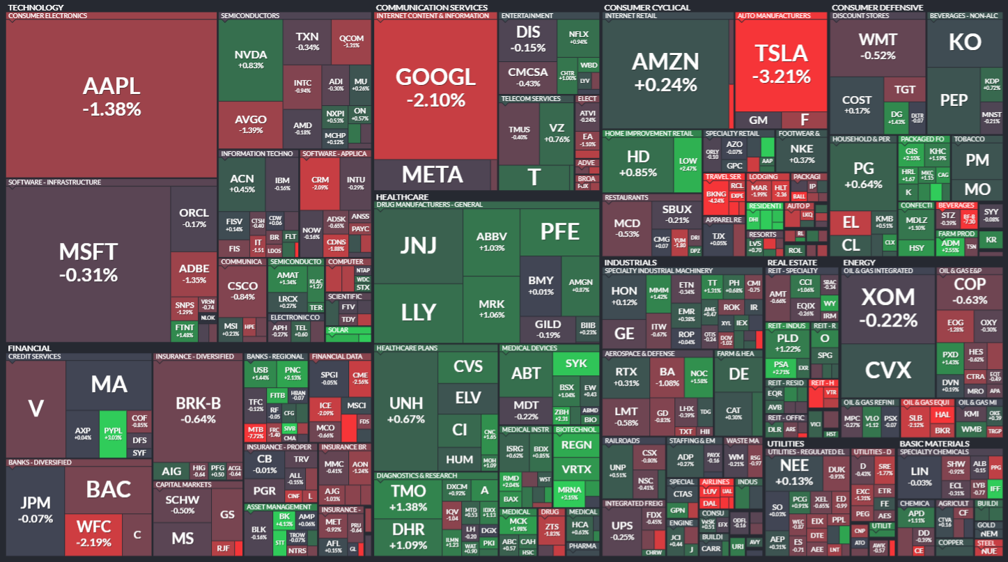 미국 S&P500에 속한 기업들의 주가 등락을 살펴봅니다. 같은 섹터 내에서도 개별 기업 이슈로 인해 주가가 서로 다르게 움직이는 것을 볼 수 있습니다. 특히 섹터 내 대장주, 주도주의 움직임을 통해 해당 섹터의 성장성을 가늠해보기 좋습니다.