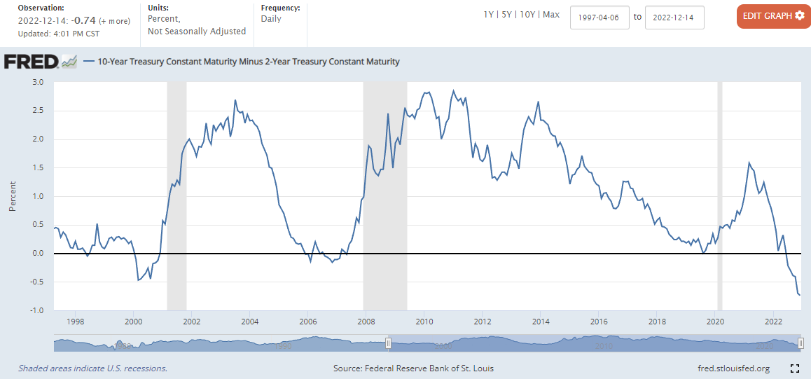 22년 4월 1일 미국 장단기 금리차 역전 항상 미국 10년 물 국채 수익률과 2년 물 국채 수익률의 차이가 마이너스에 도달하면, 1~3년 이내에 경기침체가 일어났었습니다. (위 그래프는 10년 물과 2년