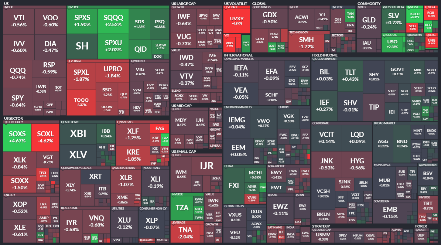 미국 ETF의 등락률을 통해서 시장의 흐름을 살펴봅니다. 특히 주가 MAP과는 다르게 채권이나 원자재, 개발도상국 지수 추종 ETF 등도 살펴볼 수 있기 때문에 좀 더 큰 시장의 흐름을 알 수 있습니다.