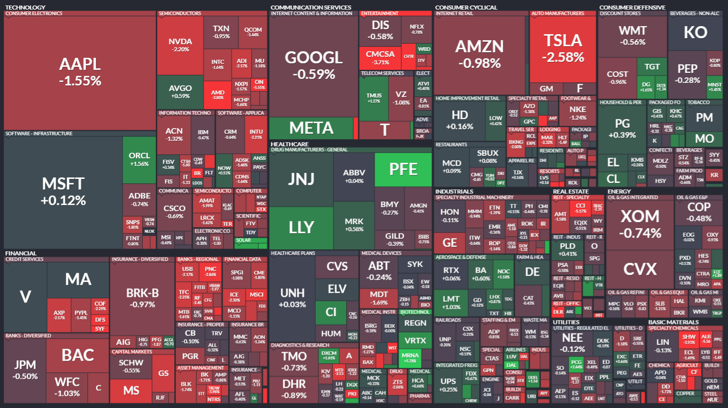 미국 S&P500에 속한 기업들의 주가 등락을 살펴봅니다. 같은 섹터 내에서도 개별 기업 이슈로 인해 주가가 서로 다르게 움직이는 것을 볼 수 있습니다. 특히 섹터 내 대장주, 주도주의 움직임을 통해 해당 섹터의 성장성을 가늠해보기 좋습니다.