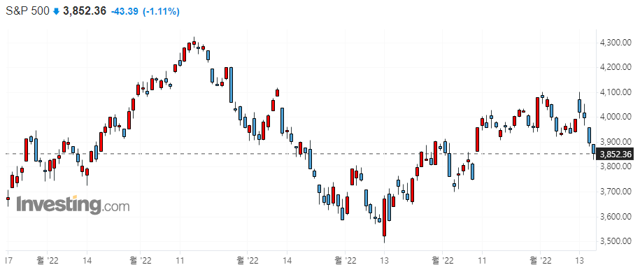 다우 -0.85% / S&P500 -1.11% / 나스닥 -0.97% / 러셀 2000 -0.63%