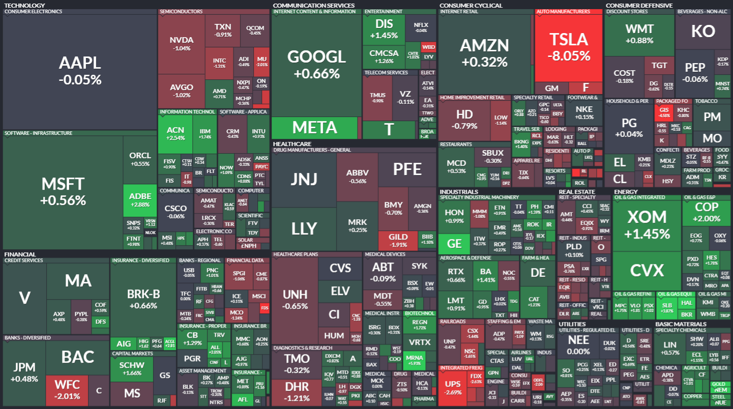 미국 S&P500에 속한 기업들의 주가 등락을 살펴봅니다. 같은 섹터 내에서도 개별 기업 이슈로 인해 주가가 서로 다르게 움직이는 것을 볼 수 있습니다. 특히 섹터 내 대장주, 주도주의 움직임을 통해 해당 섹터의 성장성을 가늠해보기 좋습니다.