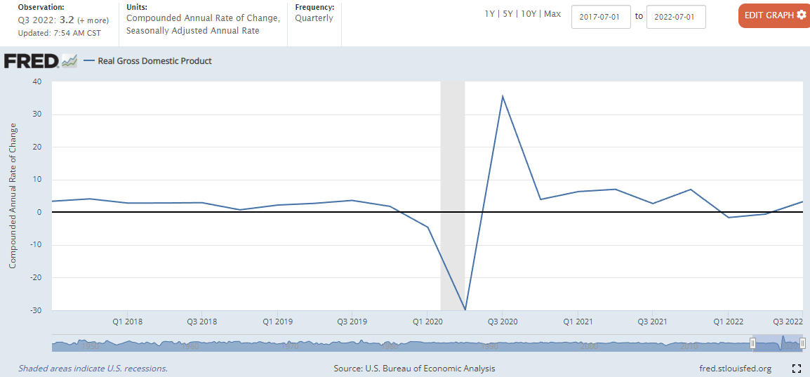 미국의 경제 성잘률이 2분기 연속 마이너스인 경우 기술적으로 경기 침체를 의미하는데요. 이미 1분기와 2분기 얕지만 마이너스를 기록한 후, 3분기에는 오히려 미국 GDP가 3.2%로 극적인 반등을 보여준 상황입니다.