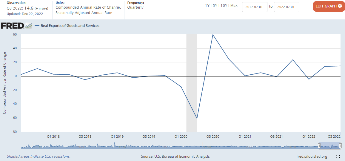 상식적으로 강달러 상황에서는 미국의 수출이 감소하는 모습을 보이는 것이 정상이지만, 이번 미 상무부가 GDP를 발표하면서 내놓은 자료에 따르면 오히려 수출의 증가가 미국 GDP 상승에 영향을 미친 것으로 볼 수 있습니다.