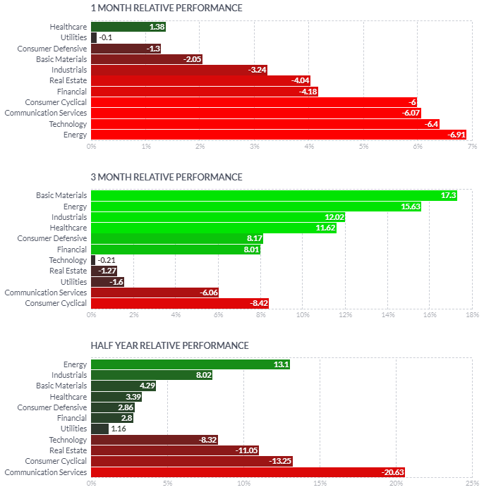 1일/한달/3달/반년 섹터별 등락률을 통해서, 시장 상황을 가늠해볼 수 있습니다.