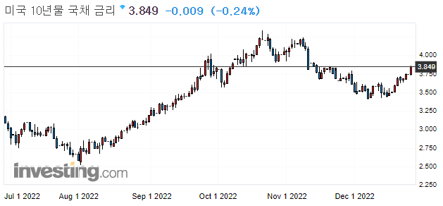 10년물 국채 수익률 3.849 / 2년물 국채 수익률 4.3827 / 3개월물 국채 수익률 4.3110