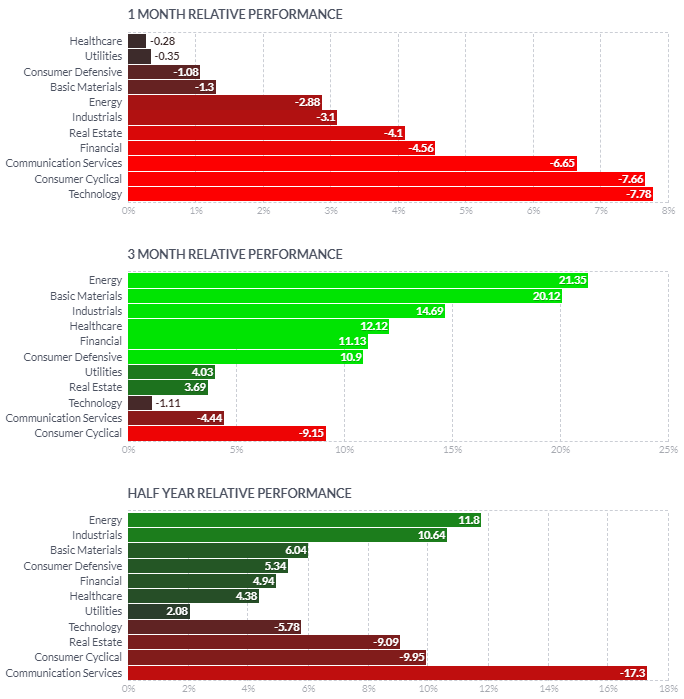 1일/한달/3달/반년 섹터별 등락률을 통해서, 시장 상황을 가늠해볼 수 있습니다.