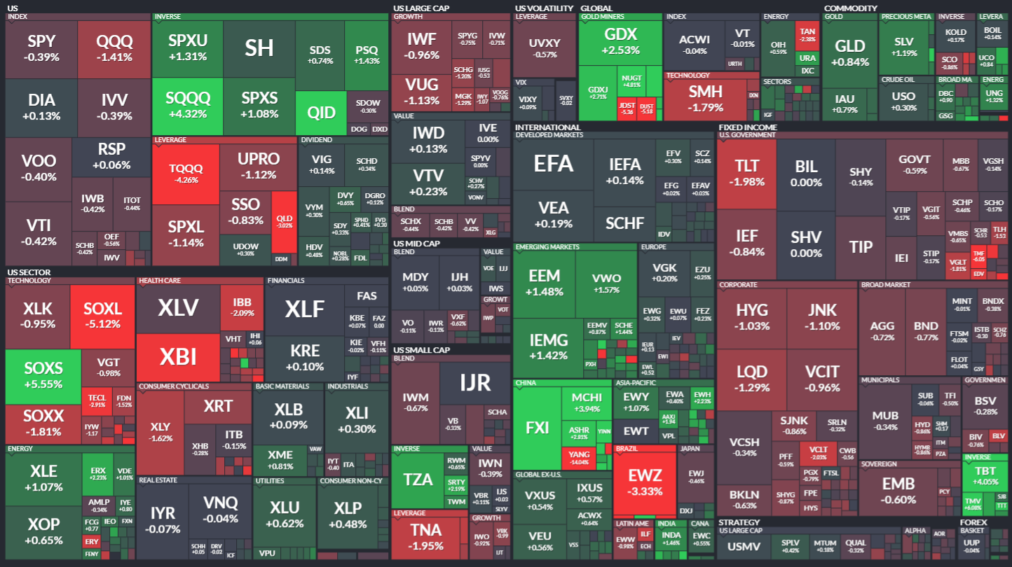 미국 ETF의 등락률을 통해서 시장의 흐름을 살펴봅니다. 특히 주가 MAP과는 다르게 채권이나 원자재, 개발도상국 지수 추종 ETF 등도 살펴볼 수 있기 때문에 좀 더 큰 시장의 흐름을 알 수 있습니다.