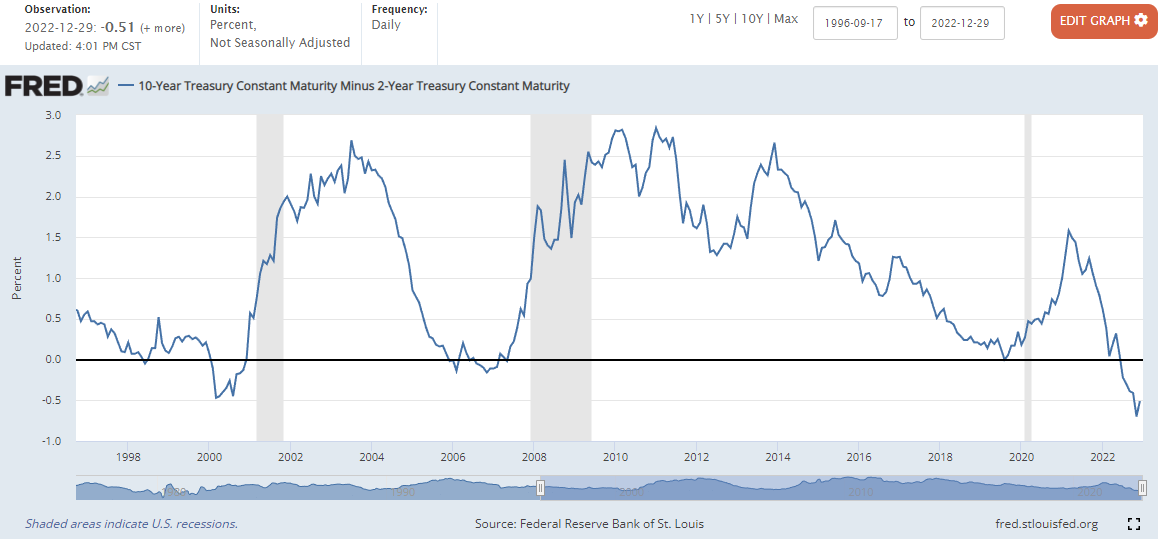 22년 4월 1일 미국 장단기 금리차 역전 항상 미국 10년 물 국채 수익률과 2년 물 국채 수익률의 차이가 마이너스에 도달하면, 1~3년 이내에 경기침체가 일어났었습니다. (위 그래프는 10년 물과 2년