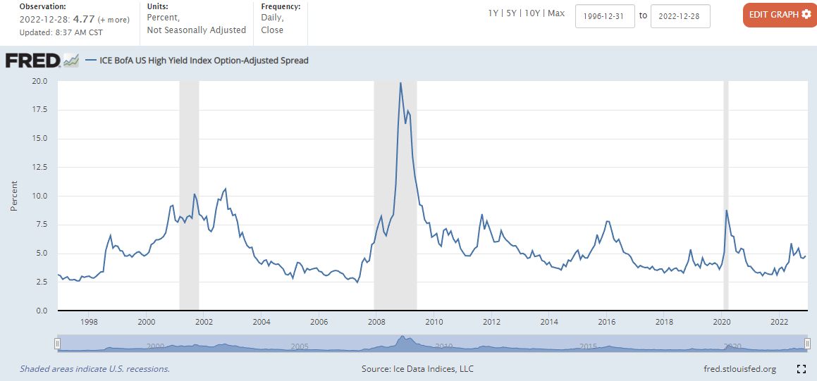 하이일드 채권 스프레드 : 하이일드 채권 수익률 에서 국채 수익률을 뺀 값으로, 이 값이 상승하면 시장이 위험하다는 신호로 볼 수 있습니다. 4% 이하로 하락해야 시장이 안정적인 것으로 판단합니다.