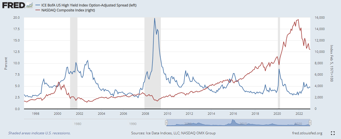 하이일드 채권 스프레드 : 하이일드 채권 수익률 에서 국채 수익률을 뺀 값으로, 이 값이 상승하면 시장이 위험하다는 신호로 볼 수 있습니다. 4% 이하로 하락해야 시장이 안정적인 것으로 판단합니다.