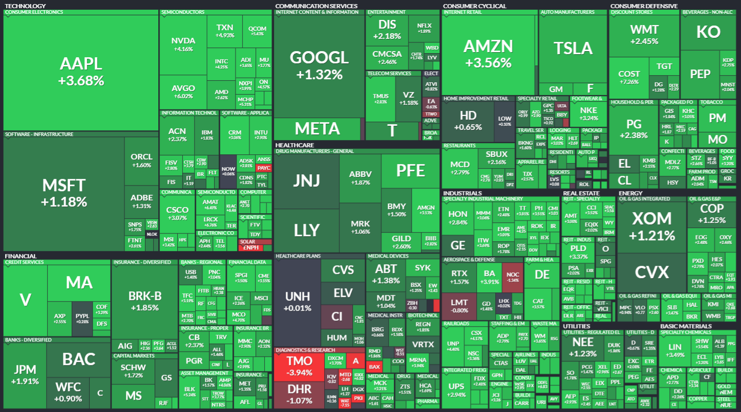 미국 S&P500에 속한 기업들의 주가 등락을 살펴봅니다. 같은 섹터 내에서도 개별 기업 이슈로 인해 주가가 서로 다르게 움직이는 것을 볼 수 있습니다. 특히 섹터 내 대장주, 주도주의 움직임을 통해 해당 섹터의 성장성을 가늠해보기 좋습니다.