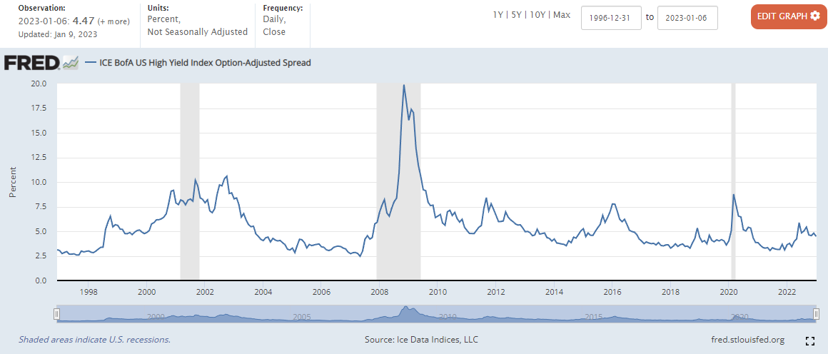하이일드 채권 스프레드 : 하이일드 채권 수익률 에서 국채 수익률을 뺀 값으로, 이 값이 상승하면 시장이 위험하다는 신호로 볼 수 있습니다. 4% 이하로 하락해야 시장이 안정적인 것으로 판단합니다.