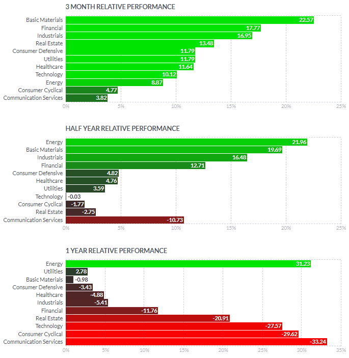 1일/한 달/3달/반년 섹터별 등락률을 통해서, 시장 상황을 가늠해볼 수 있습니다.