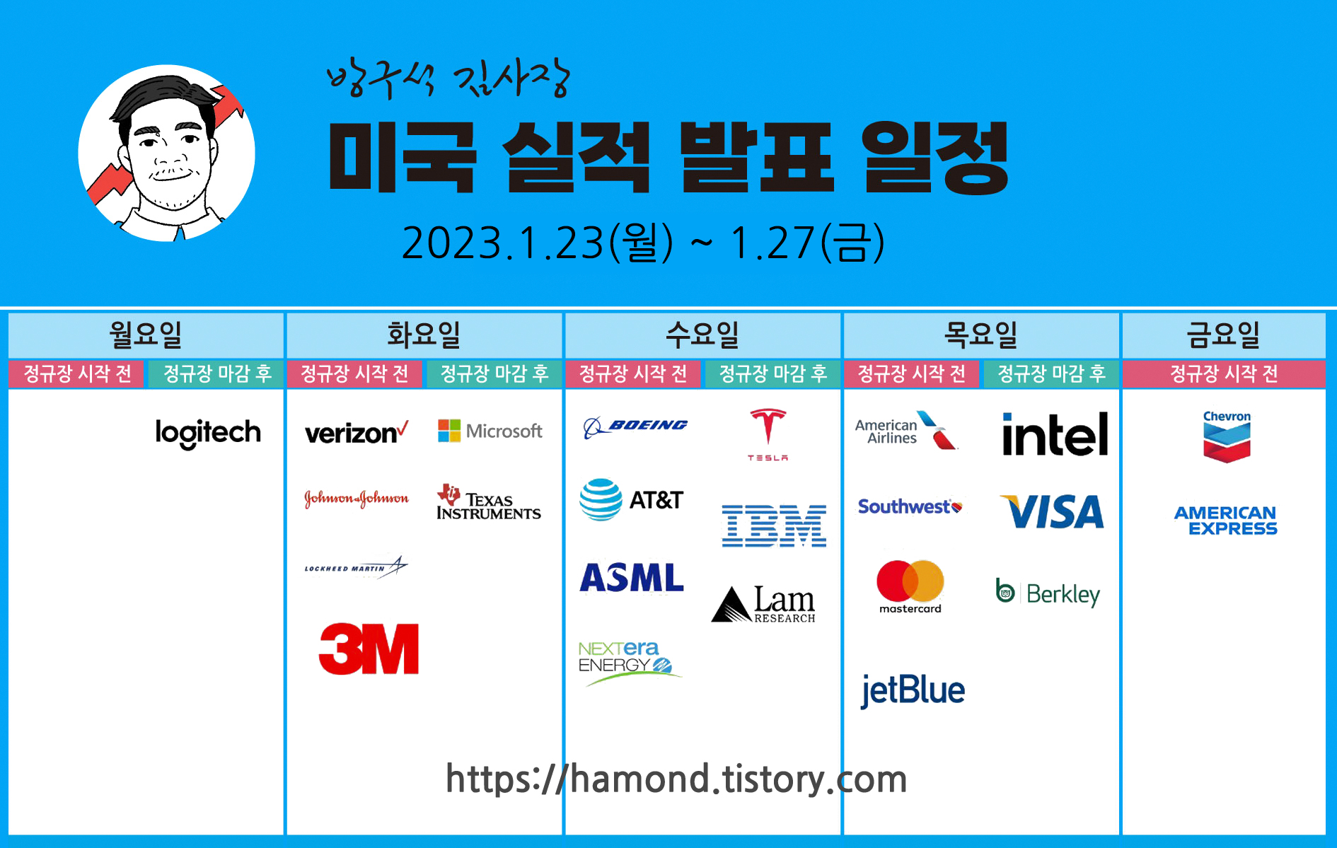23년 1월 16일~1월20일까지 어닝 일정 어닝 발표일뿐만 아니라 발표 시간도 매우 중요합니다. 당일 주식 시장에 어닝 결과가 반영되었는지 여부에 따라, 당일 해당 주식을 추가 매수해야 할지, 매