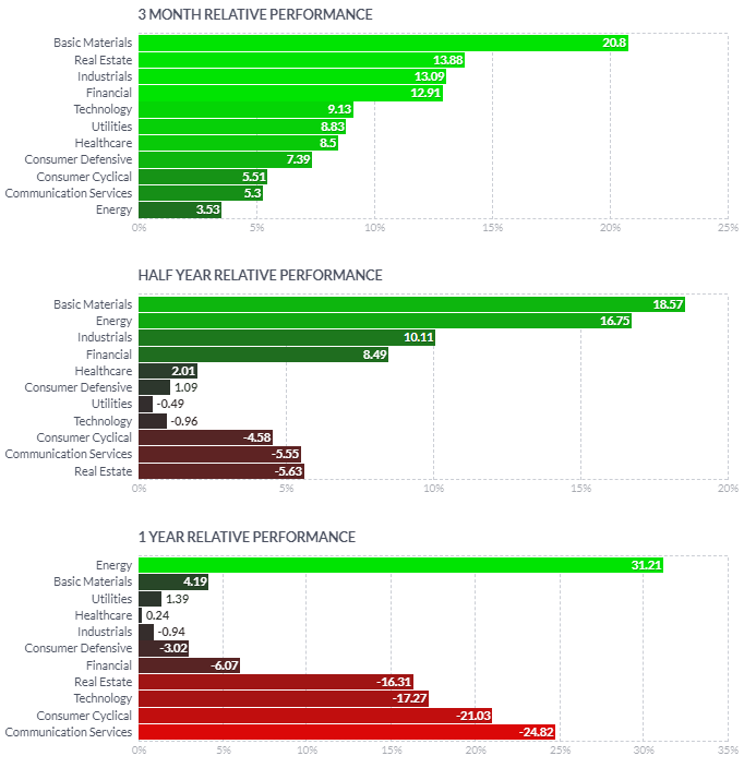 1일/한 달/3달/반년 섹터별 등락률을 통해서, 시장 상황을 가늠해볼 수 있습니다.