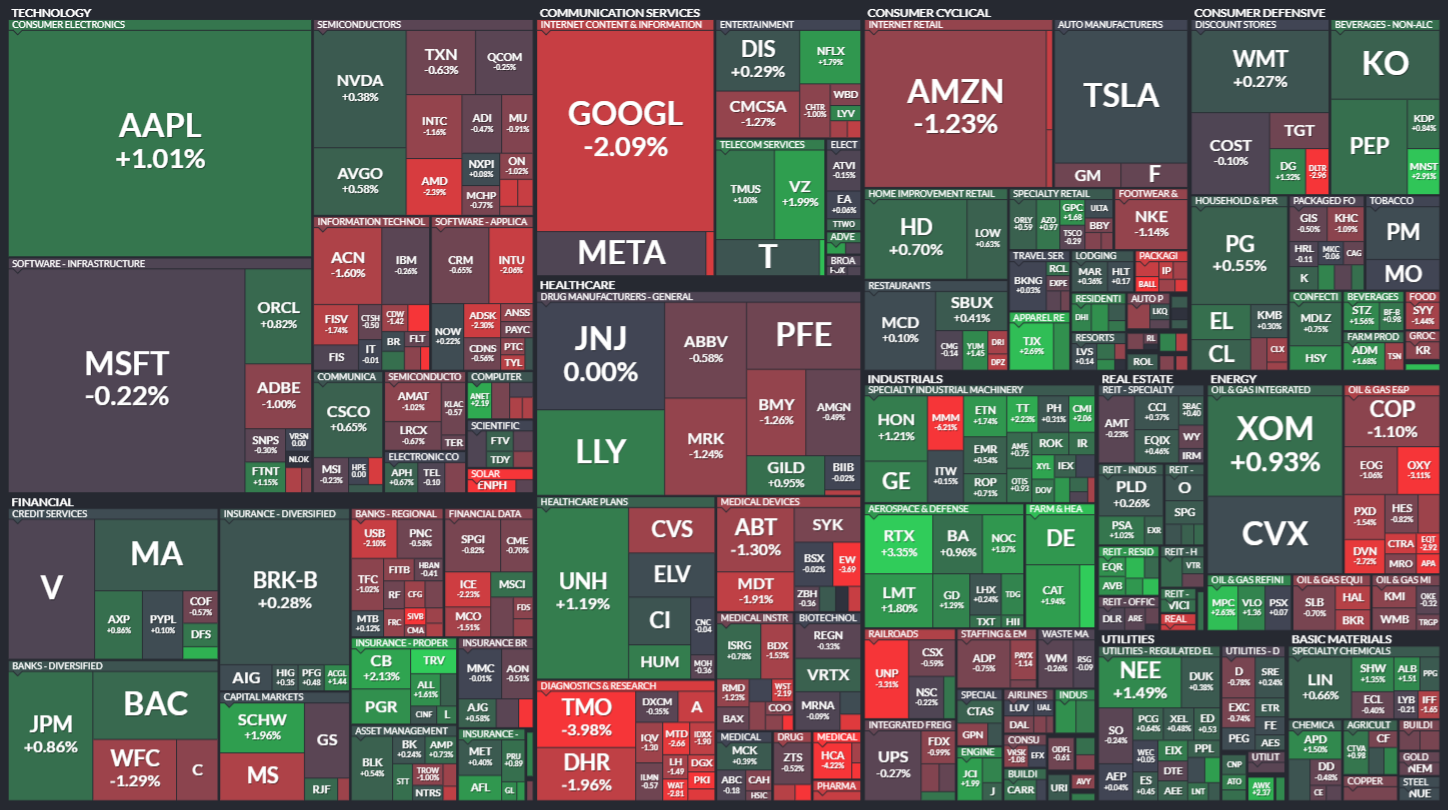 미국 S&P500에 속한 기업들의 주가 등락을 살펴봅니다. 같은 섹터 내에서도 개별 기업 이슈로 인해 주가가 서로 다르게 움직이는 것을 볼 수 있습니다. 특히 섹터 내 대장주, 주도주의 움직임을 통해 해당 섹터의 성장성을 가늠해 보기 좋습니다.