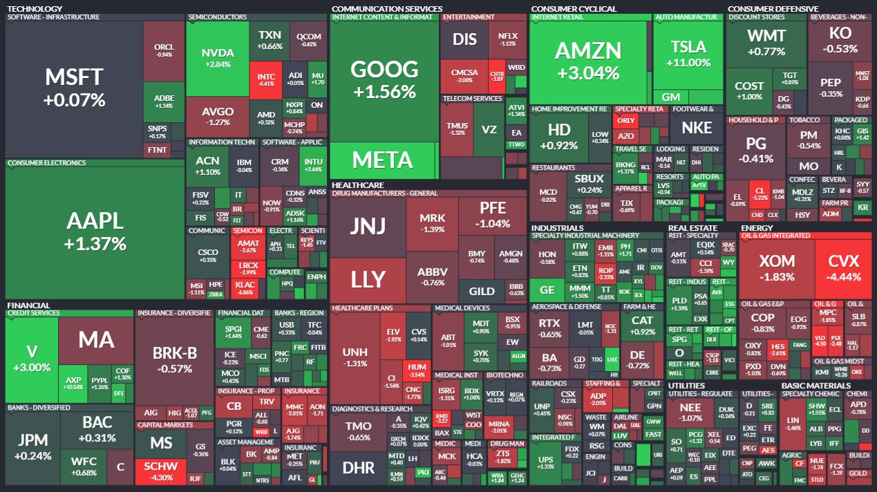 미국 S&P500에 속한 기업들의 주가 등락을 살펴봅니다. 같은 섹터 내에서도 개별 기업 이슈로 인해 주가가 서로 다르게 움직이는 것을 볼 수 있습니다. 특히 섹터 내 대장주, 주도주의 움직임을 통해 해당 섹터의 성장성을 가늠해 보기 좋습니다.