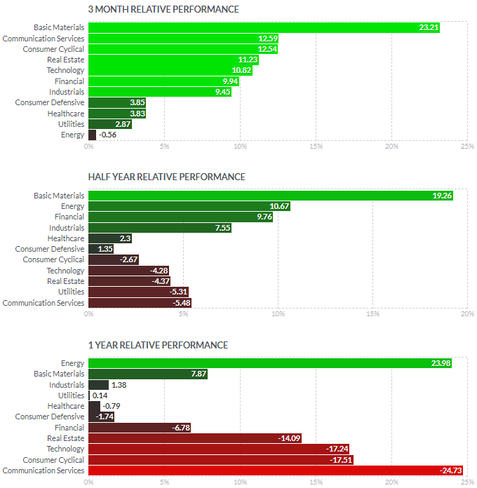 1일/한 달/3달/반년 섹터별 등락률을 통해서, 시장 상황을 가늠해볼 수 있습니다.