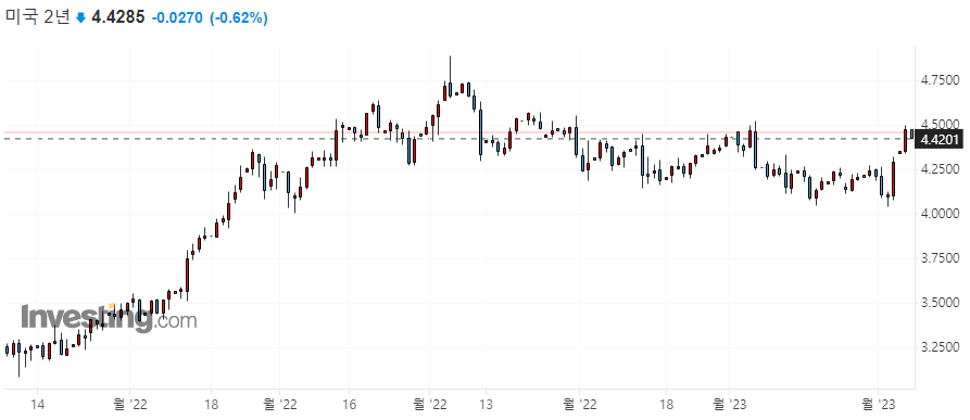 | 미국 채권 시황) 비둘기 파월을 안 믿는 채권 시장! _23년2월8일 (1) | 2023.02.08 |