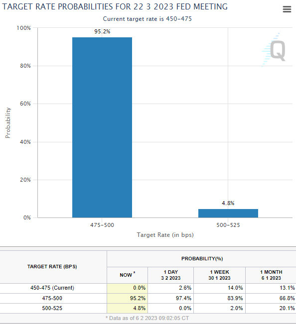 2월 3일 금요일 발표된 미국 비농업고용지수는 51.7만 건으로 예측치인 18.5만 건보다 2배 이상 높았습니다. 이러한 비농업고용지수의 폭발적인 증가는 연준이 추가 금리 인상을 할 수 있다는 우려를 자아냈으며, 이를 반영하 듯 FedWatch 또한 3월,5월에 예상 최종 기준 금리를 더 높이는 모습입니다.