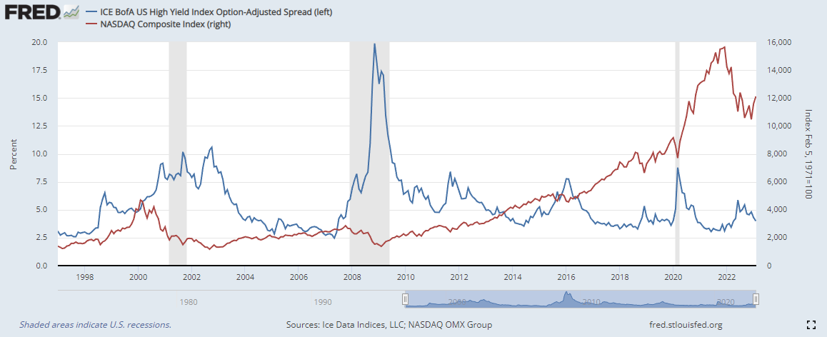 하이일드 채권 스프레드 : 하이일드 채권 수익률 에서 국채 수익률을 뺀 값으로, 이 값이 상승하면 시장이 위험하다는 신호로 볼 수 있습니다. 4% 이하로 하락해야 시장이 안정적인 것으로 판단합니다.