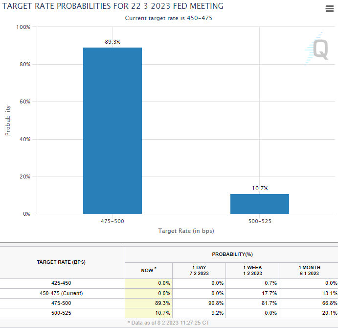 2월 3일 금요일 발표된 미국 비농업고용지수는 51.7만 건으로 예측치인 18.5만 건보다 2배 이상 높았습니다. 이러한 비농업고용지수의 폭발적인 증가는 연준이 추가 금리 인상을 할 수 있다는 우려를 자아냈으며, 이를 반영하 듯 FedWatch 또한 3월,5월에 예상 최종 기준 금리를 더 높이는 모습입니다.