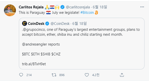 남미 파라과이 공화국의 Carlitos Rejala 의원은 SNS를 통해 파라과이에서는 7월에 비트코인에 관한 법률이 입법될 것이라고 밝혔다.법안 내용은 해외 비트코인 마이닝 업체 및 크립토 관련 업체들에 관한 것으로 알려졌다.