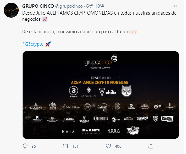 파라과이의 대기업 엔터테인먼트 기업 Grupo Cinco는 18일, 운영하는 나이트클럽이나 레스토랑등의 시설이 7월부터, 비트코인(BTC), 이더리움(ETH), 치리즈(CHZ), SHIB(시바이누)의 4 종목에 의한 결제에 대응한다고 발표, 「가상화폐를 접수하는 것으로, Grupo Cinco는 미래를 향해서 혁신의 한 걸음을 내딛고 있다.